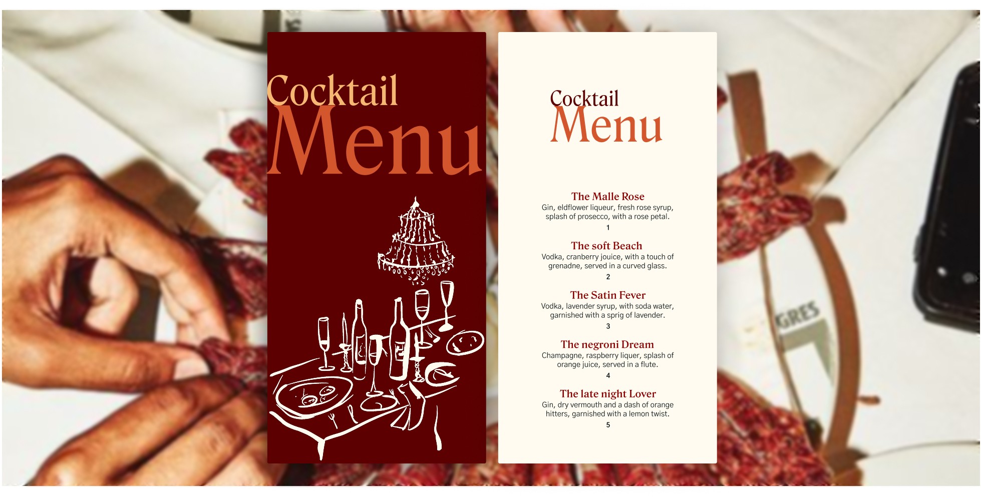 Branding elements, a menu, website, and custom illustrations were created to bring Muse’s identity to life. Deep reds, velvet textures, and bold typography set a sophisticated tone, while playful illustrations add a lively feeling.